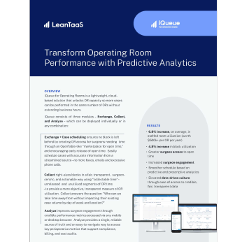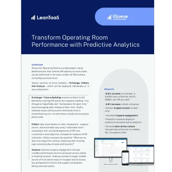 LeanTaaS' iQueue for Operating Rooms digitizes the workflow, streamlines the scheduling process and improves accuracy. The digital process leads to fewer delays and higher levels of patient, surgeon, clinic and staff satisfaction. iQueue for Operating Rooms provides easy access to real-time data with rich drill downs, clear visualizations and prescriptive analytics. As a result, the leadership is more confident, surgeons are more engaged, and the organization is able to have more objective conversations around performance metrics.